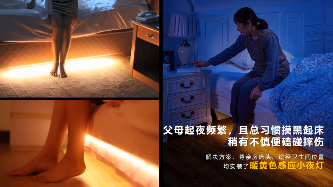 4、卧室到卫生间的过道上装有感应小夜灯,父母起夜不摸黑,也不用担心强光影响睡眠;